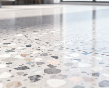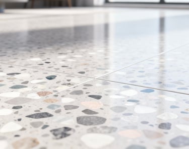 Seamless composite floors with marble/glass chips in epoxy/cement matrix for durable, customizable high-traffic commercial spaces.